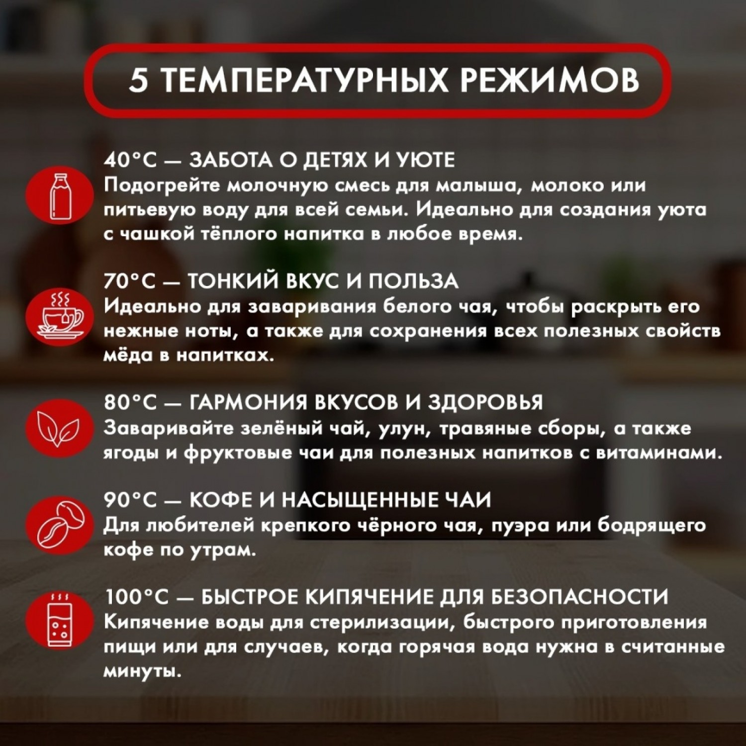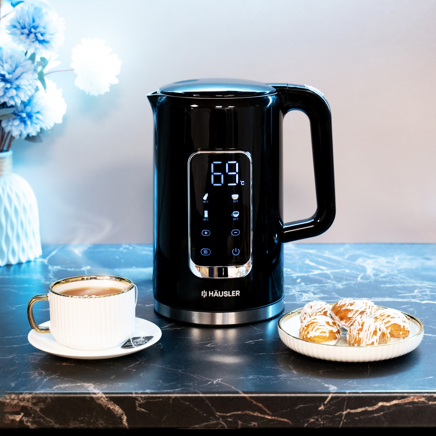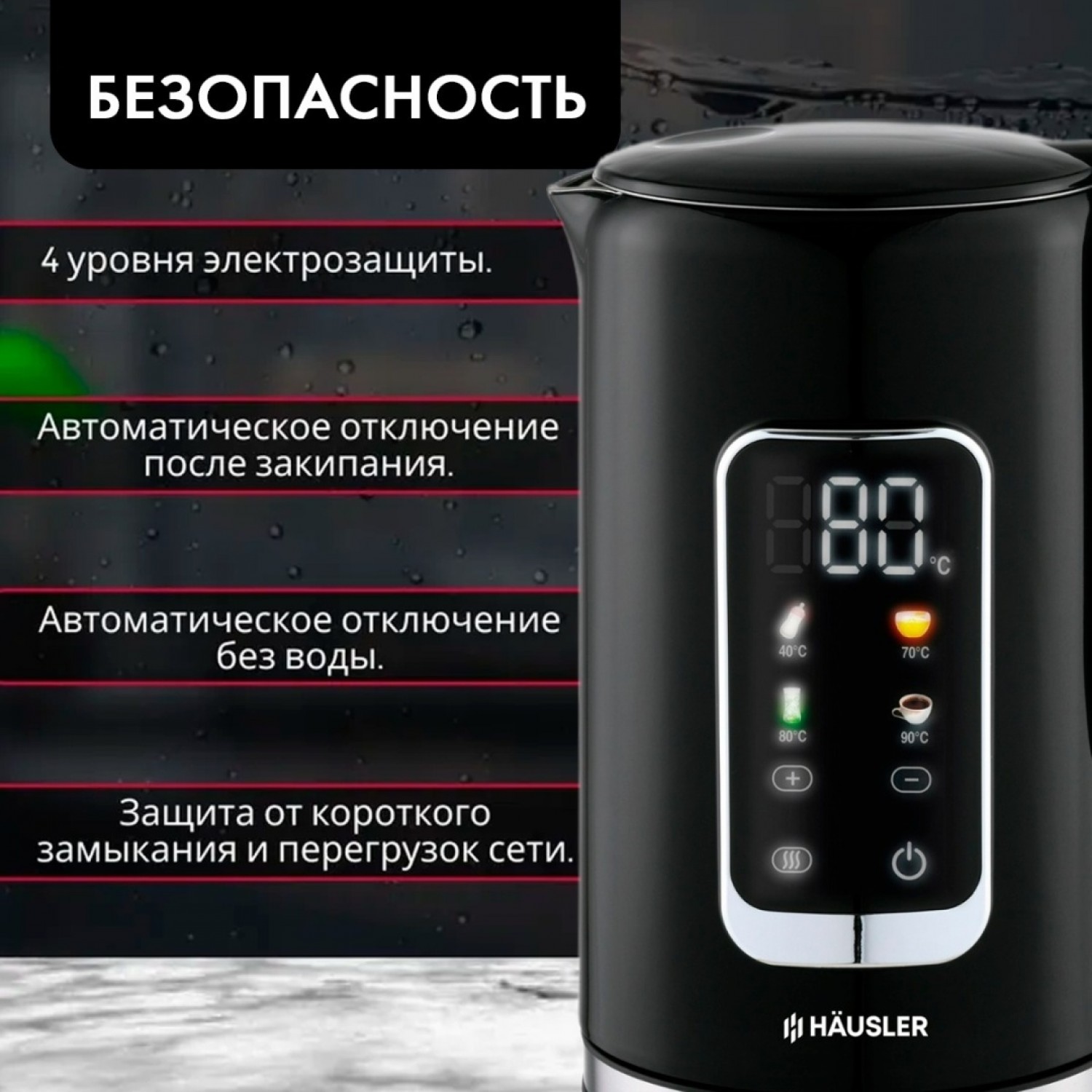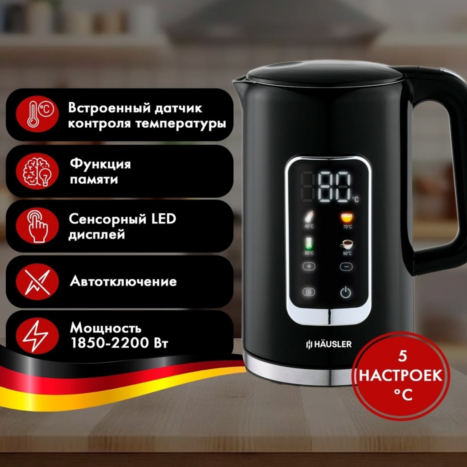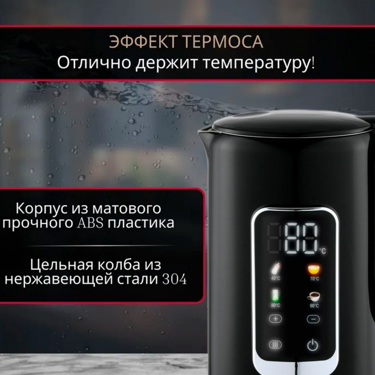 Объем: 1,7 л. Мощность: 1850-2200 Вт. Вращение на 360°. Управление: сенсорное. Регулировка температуры пять уровней: 40, 70, 80, 90, 100